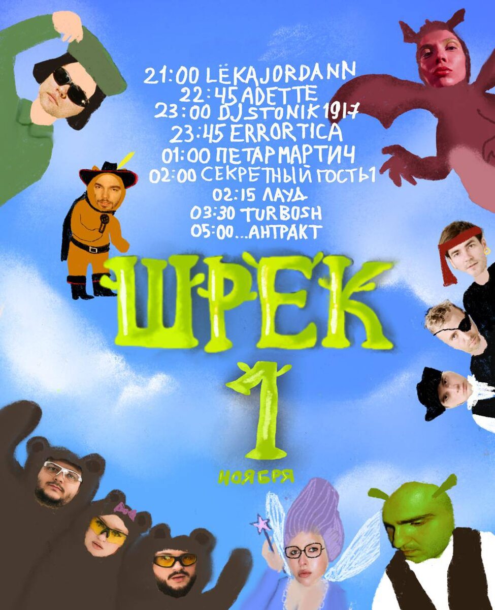 ШРЕК ВИКЕНД 1 и 2 ноября В тридевятом царстве, в тридесятом государстве жил-был один зеленый великан. Было у него всё чётко, пока в его Диско-Болото не припёрлись парни из Уфы с идеей устроить пати. И началось: кутили они два дня и две ночи, пиво лилось по усам. Всё это — Шрек Викенд, который Дискоклуб срежиссировал вместе со Стерео Шириной. Арт: Ира Беспалова 🎫 Билеты / Дресс код FC DC 18+ 📆 1 и 2 ноября 📍 ДК Кристалл, Москва, Самокатная 4с11