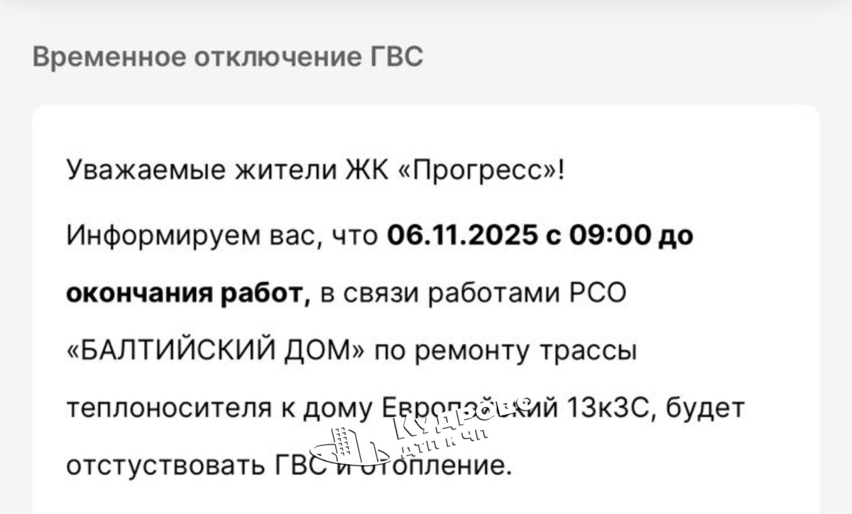 В некотрых домах в Кудрово отключат ГВС и отопление 6 ноября, в связи с ремонтом теплотрассы Жители Кудрово вновь столкнутся с ремонтными работами на сетях горячего водоснабжения. На этот раз отключение ГВС и отопления коснётся жилищного комплекса "Прогресс", который включает в себя дома: Европейский пр-т. 13, Европейский пр-т. 13к1, Европейский пр-т. 13к2, Европейский пр-т. 13к3, Европейский пр-т. 13к4, Европейский пр-т. 13к5, Европейский пр-т. 13к6. Горячее водоснабжение и отопление будут отсутствовать 6 ноября с 9:00 до завершения работ. ДТП и ЧП Кудрово
