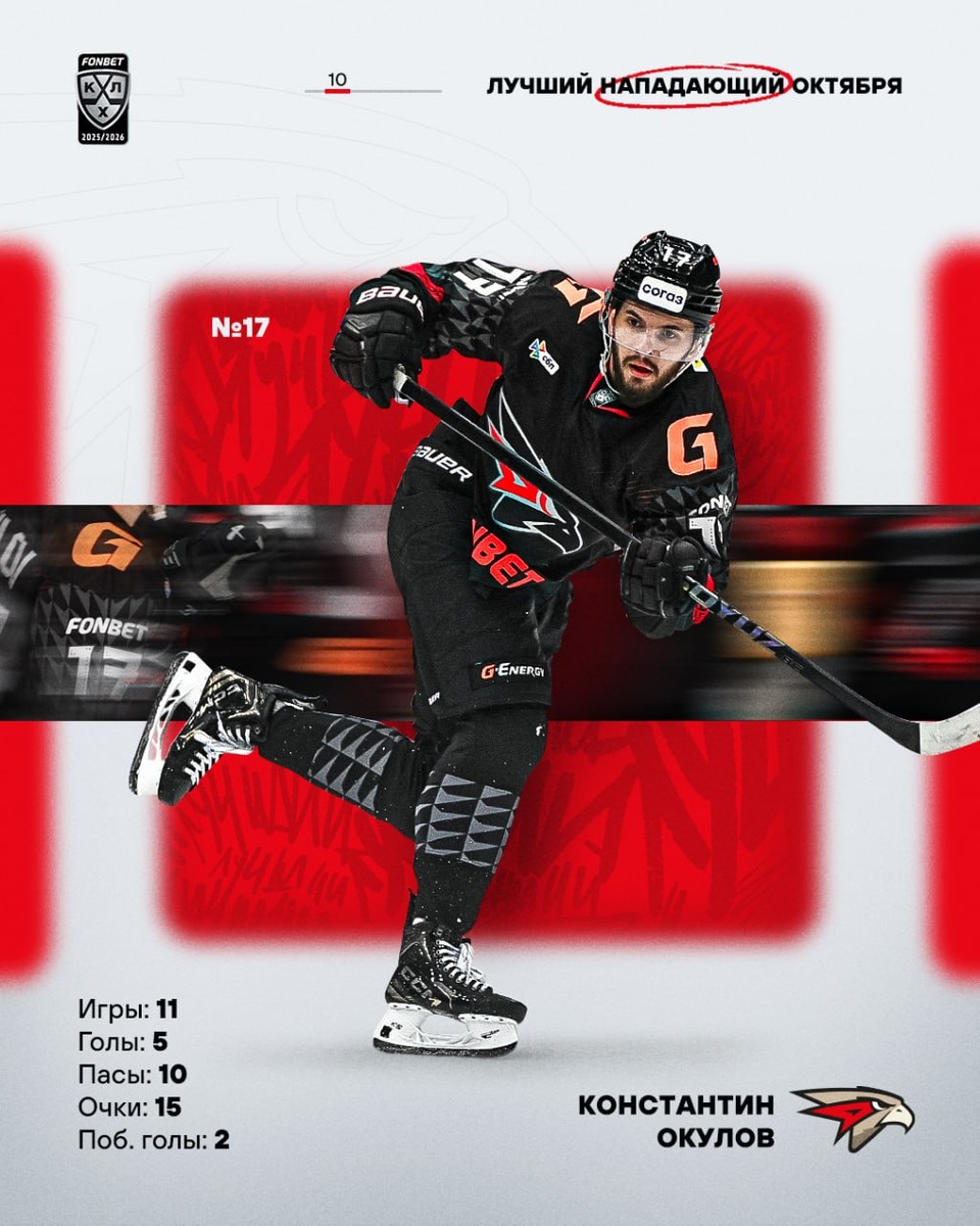 🦅 Константин Окулов набрал очки в 8 из 11 игр «Авангарда» в октябре и впервые в карьере был признан лучшим нападающим месяца в КХЛ