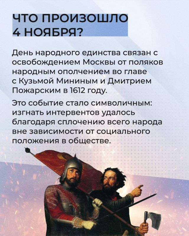 Семь бояр - и все бояки, Глупые предатели! Вдруг решили, что поляки Нам друзья-приятели. Влад на царство, мол, сгодится, Что из рода Ваза. Православным согласится Стать, наверно, сразу? Будут бунт, мол, подавлять Польские правители... Пригласили ляхов рать... Ляхи те - грабители! Во главе - немолодой, Опытный и дерзкий Польский гетман удалой - Станислав Жолкевский. . Это кто ж так управляет?! Грабят да на...илуют! Несогласных у...ивают, Никого не милуют! Там командует Гонсевский, Толь литовец, толь поляк... Еще хуже, чем Жолкевский, Всех готов стереть во прах. Листьев яркая палитра В небесах Москвы осенней... Минин и Пожарский Дмитрий Создавали ОПОЛЧЕНИЕ. . Люд простой, стрельцы... - все в войско, Как единое сплотились, Гнали ляхов в Царство Польско, Чтоб они не возвратились. Ну, а день ОСВОБОЖДЕНИЯ - Наша праздничная дата. И дай Бог нам ЕДИНЕНИЯ, А так, чтоб "с краю хата..." . ВСЕ КАРТИНКИ ИЗ ОТКРЫТЫХ ИСТОЧНИКОВ