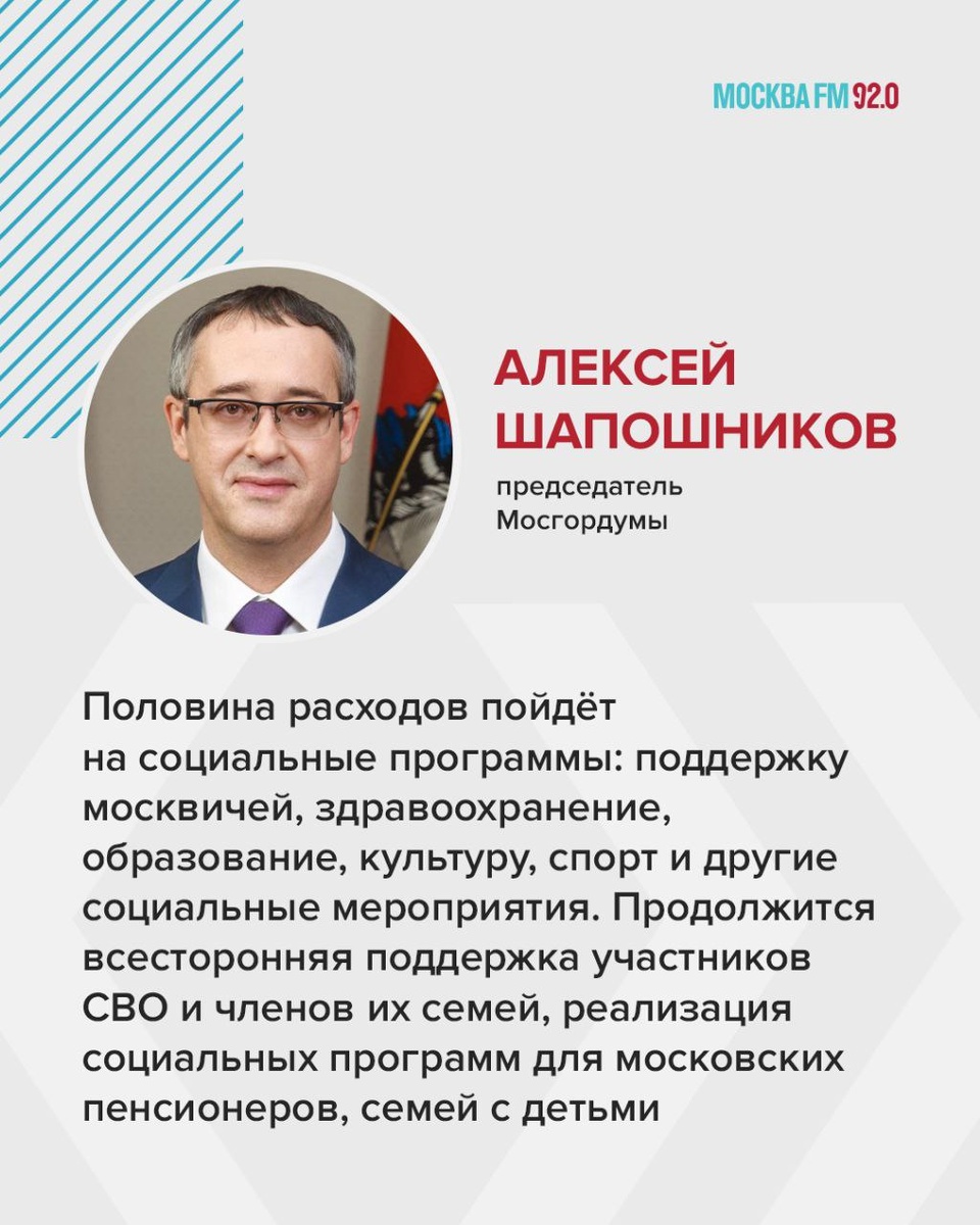 ✅ Одобрен социально ориентированный бюджет Москвы на 2026–2028 годы Документ предусматривает рост расходов на эту сферу на 15% и средства на реализацию 13 госпрограмм. 🗣 Бюджет столицы традиционно социальный, заявил председатель Мосгордумы Алексей Шапошников: В бюджете заложены средства на увеличение зарплат работникам бюджетной сферы, дальнейшее повышение качества предоставляемых услуг москвичам. Предусмотрены средства на реализацию проектов по созданию новых производств, формирование комфортной и безопасной городской среды. 📌 Подписаться на Москва FM / Наш чат-бот / Мы в MAX