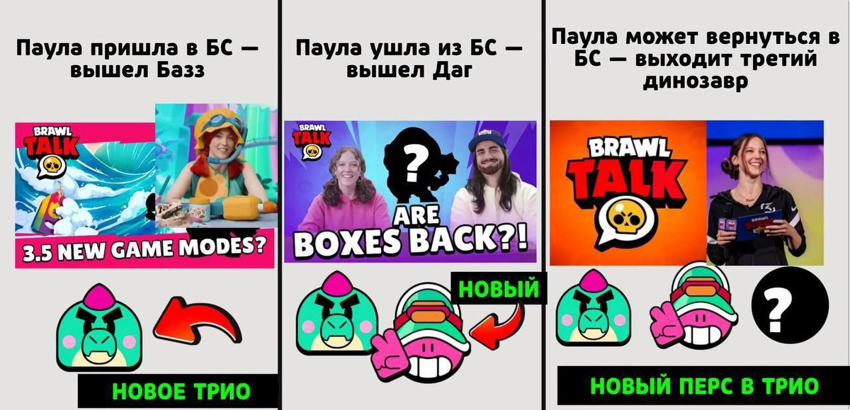 😄 Все было продумано Комьюнити заметило интересную цепочку событий, связанную с Паулой. Когда она пришла в игру, вышел Базз, когда Паула уходила с БС, вышел Даг, второй персонаж в трио. Сейчас она может вернуться в Brawl Stars, вместе с этим нашли бравлера-динозавра в файлах игры. Удивительное совпадение или план Supercell? ✅Новости по Clash Royale - ТЫК ✅Новости по Телеграмм подаркам, NFT - ТЫК Мир Supercell. Подписаться