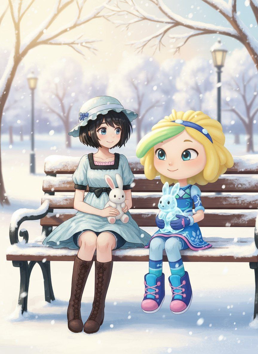 Зимнее утро. Сквозь кружево инея на окнах пробивается мягкий солнечный свет. В небольшом заснеженном парке, возле лавочки, стоит девушка с короткими светлыми волосами и голубыми глазами — Снежка. На её варежке сидит крошечный снежный зайчонок из льда, созданный её магией. Она улыбается ему, когда вдруг слышит весёлый голос: — Тутуру~! Какой милый зайчик! Снежка удивлённо оборачивается и видит Маюри — ту самую странную гостью, будто сошедшую с другого мира. У Маюри на голове лёгкая шляпка с голубой лентой, а в руках она бережно держит маленького плюшевого Упу. — Это мой друг, — мягко говорит Снежка, погладив ледяного зверька. — Он не настоящий… но я всё равно его люблю. Маюри садится рядом, прижимая Упу к груди: — А это — мой Упа! Он тоже вроде игрушки, но… знаешь, иногда мне кажется, что у него есть душа. Просто очень тихая. Обе девочки улыбаются друг другу. Лёгкий снег падает на их плечи, кружится в воздухе, словно откликаясь на их доброту. Снежка протягивает ладонь, и снежный за