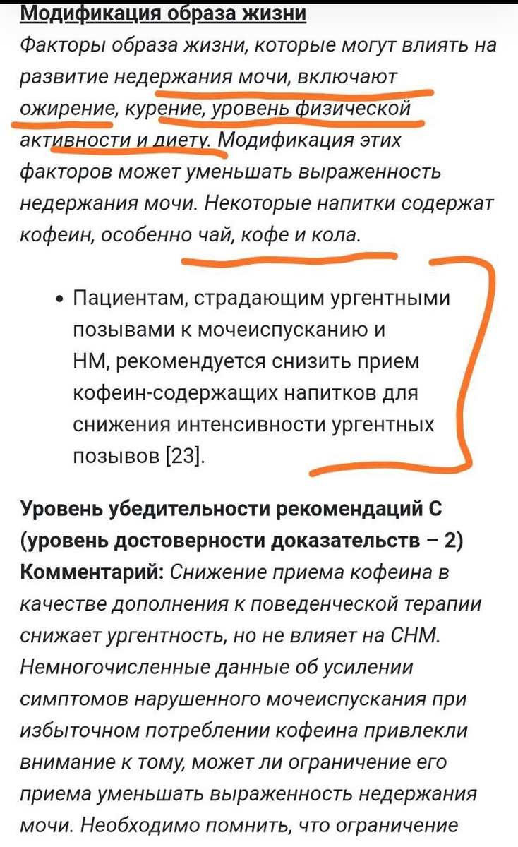 Доказано, что кофе, алкоголь, курение, лишний вес, низкая или избыточная физическая активности - вызывают усиление симптомов недержания. И это доказано и включено в клинические рекомендации.