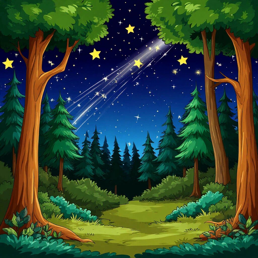 Однажды тёплым августовским вечером воздух в лесу был особенно прозрачным и свежим. Сова Улилла, пролетая над норкой Масяни, прокричала важную новость: — У-у-ху! Сегодня ночью будет большой звёздопад! Не пропустите! У-у-ху! Масяня сразу же вспомнила бабушкину сказку о том, что если загадать желание на падающую звезду, то оно обязательно сбудется. Она быстро собрала всех своих друзей: зайку Малютку, белочку Беллу, ёжика Пыхтельку и даже старого крота Умника, которого она осторожно вывела на поверхность. — Мы должны найти самое лучшее место для наблюдений! — объявила она. Таким местом оказалась Большая Скала на самом высоком холме в лесу. Оттуда открывался прекрасный вид на всё ночное небо. Друзья устроились поудобнее: расстелили мягкий мох, приготовили угощение из лесных ягод и терпеливо уставились на тёмный бархатный небосвод, усыпанный миллионами сверкающих бриллиантов. Первая звезда сорвалась с неба молниеносно, оставив за собой тонкий серебристый шлейф. — Ой! — дружно ахнули зверята