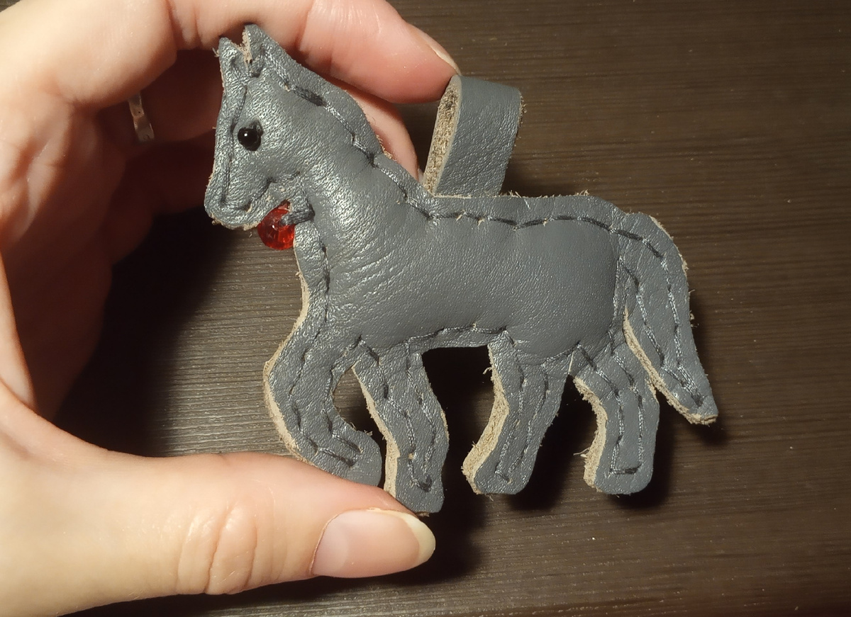Первый - вот такая лошадка из серой кожи с красным кулончиком.