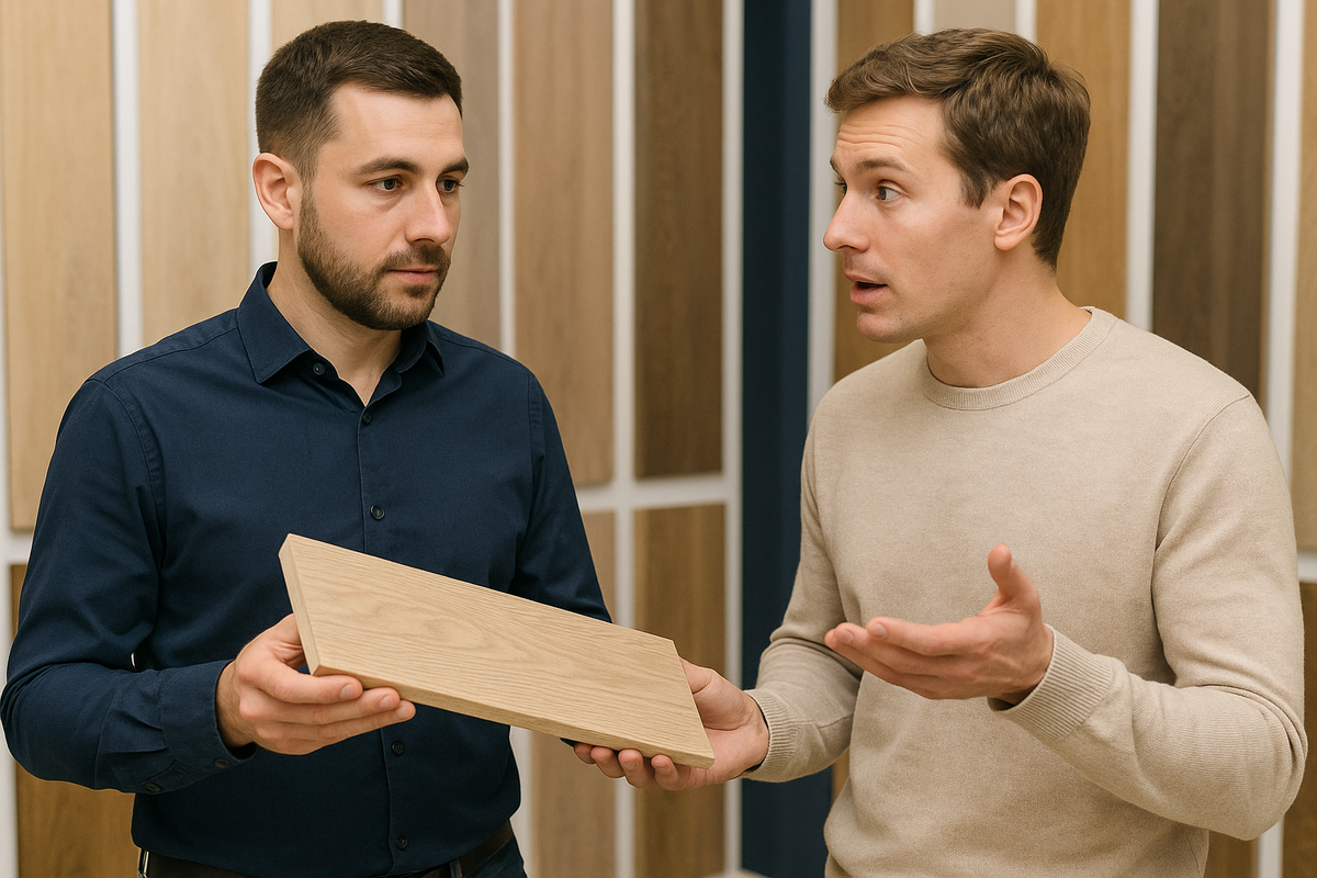 Ожидания внешнего вида формируйте через реальные фото партии, а не только через витрину. Влажность на объекте перед укладкой — важна: инженерная доска допускает более широкие колебания из-за многослойной конструкции, массив требует строгого климатического контроля. При получении товара фиксируйте влажность верхнего слоя влагомером и оформляйте акт приёмки. Чем «чище» селекция (Select, AB), тем заметнее отклонения — и тем важнее предварительная раскладка и отбраковка спорных плашек, плюс запас +10–15% на отход.