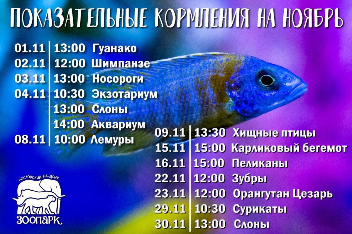 Показательные кормления в Зоопарке на ноябрь 🔹3 ноября (первый понедельник месяца) - Галерея приматов, 🔹5 ноября (первая среда месяца) - Террариум, 🔹6 ноября (первый четверг месяца) - павильон «Животные Африки», 🔹7 ноября (первая пятница месяца) - павильоны слонов и белого носорога, 🔹12 ноября (вторая среда месяца) - Аквариум, 🔹13 ноября (второй четверг месяца) - Экзотариум. 🫠 Детские мероприятия Ростов-на-Дону. Я местный! 📱 Мероприятия Ростов-на-Дону. Я местный! в MAX