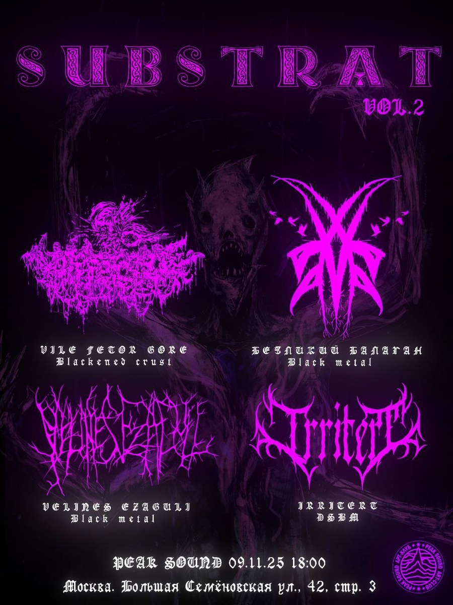 Москва ● Peak Sound ● 09.11.2025 (Вс) ● 18:00 #black #grindcore #metal #punk ► SUBSTRAT II ● TG ● VK Тьма разверзлась вновь. СУБСТРАТ закипает вновь, и на свет выходят новые порождения мрака. Не пропустите это явление и приходите.. Участники: ► Безликий Балаган ● TG ● VK ► Velines Ezaguli ● TG ● VK ► Irritert ● TG ● VK ► VILE FETOR GORE ● TG ● VK Билеты от 500₽