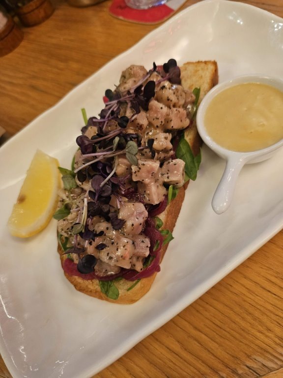 Раньше я даже подумать не могла, что на острове Канта можно поужинать за адекватные деньги. На этот раз решила проверить, т.к. в первый вечер пошла прогуляться совсем ненадолго, а жила рядом с островом. Оказалось, прямо у собора есть маленькая миленькая кафешка Кухня Де Прусс. Увидела на карте и пошла туда, т.к. рейтинг высший, а цены приемлемы. Боялась, что не попаду - места там немного, а сезон летней веранды уже закончился. Но для меня нашлось отличное местечко у окна. Ожидание было совсем недолгое, внимания от официантов мне хватало. Я заказала бриошь с рубаниной из пеламиды, а там оказался лук. Его не ем, но этот, какой-то красный маринованный, был довольно-таки ничего. Частично его убирала, но все равно ела. Все вместе очень вкусно! 3ахотелось попробовать ещё и бриошь с уткой. 3аказала тоже, а там порция была не для человека, который уже не особо голодный. Но всё равно съела, т.к. вкусно, ещё и десерт взяла... Меня заинтересовала Панна Котта с марципаном. Только вот я его там не