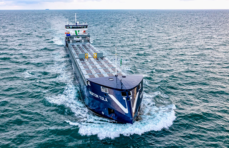 Нидерландская компания Wattlab, специализирующаяся на морских солнечных энергосистемах, открыла новый путь в устойчивом судоходстве. Она установила первую в мире полномасштабную солнечную энергосистему на морское грузовое судно. Монтаж системы был завершён в течение одного дня в порту Харлинген (Нидерланды), после нескольких месяцев испытаний. Решение было с нуля разработано роттердамским специалистом по чистой энергии Wattlab. Его смонтировали на дизель-электрическом судне MV Vertom Tula, принадлежащем морскому оператору Vertom Group. Дедвейт (полная грузоподъёмность) сухогруза составляет 7280 тонн. Инновационное решение призвано сократить выбросы и потребление топлива, обеспечивая судно надёжной возобновляемой энергией в море. Система включает 44 модуля Solar Flatracks, обеспечивающих пиковую установленную мощность (kWp - киловатт-пик) около 79 киловатт. По данным Wattlab, этого достаточно для покрытия около 20% «гостиничной нагрузки» судна (энергопотребление бортовых систем: освещен