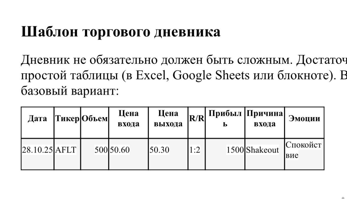 Большинство начинающих трейдеров тратят 90 % времени на поиск “идеальной точки входа” и почти не уделяют внимания анализу собственных действий. А между тем именно торговый дневник — инструмент, который помогает не только накапливать опыт, но и увеличивать прибыль за счёт дисциплины и объективного анализа. В этой статье разберём, зачем нужен дневник трейдера, что будет, если его не вести, и какой шаблон подойдёт для старта. Для чего вести торговый дневник Дневник — это не формальность. Это системный инструмент роста. Вот ключевые причины, почему его стоит вести каждому: • Объективность — на эмоциях кажется, что вы “вечно входите не туда”. А дневник показывает реальные цифры: где вы зарабатываете, а где теряете. • Осознанность — фиксируя вход, выход и причину сделки, вы начинаете понимать свои паттерны поведения и ошибки. • Оптимизация стратегии — анализ нескольких десятков сделок часто показывает, что прибыль приносят 2–3 конкретных сетапа. Остальные — балласт. • Контроль эмоций
