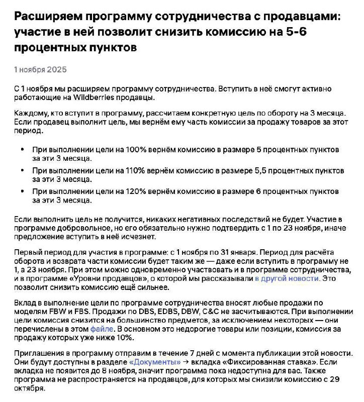 π WB ΡΠ½ΠΈΠΆΠ°Π΅Ρ ΠΊΠΎΠΌΠΈΡΡΠΈΠΈ Π°ΠΊΡΠΈΠ²Π½ΡΠΌ ΠΏΡΠΎΠ΄Π°Π²ΡΠ°ΠΌ β Π΄ΠΎ 6% ΠΈ ΠΌΡ ΠΌΠΎΠΆΠ΅ΠΌ Π²Π°ΠΌ ΠΏΠΎΠΌΠΎΡΡ ΠΏΠΎΠΏΠ°ΡΡΡ Π² ΠΏΡΠΎΠ³ΡΠ°ΠΌΠΌΡ Π‘ 1 Π½ΠΎΡΠ±ΡΡ Wildberries Π·Π°ΠΏΡΡΠΊΠ°Π΅Ρ ΠΎΠ±Π½ΠΎΠ²Π»ΡΠ½Π½ΡΡ ΠΏΡΠΎΠ³ΡΠ°ΠΌΠΌΡ ΡΠΎΡΡΡΠ΄Π½ΠΈΡΠ΅ΡΡΠ²Π°. ΠΡΠΎΠ΄Π°Π²ΡΡ ΡΠΌΠΎΠ³ΡΡ Π²Π΅ΡΠ½ΡΡΡ Π΄ΠΎ 6% ΠΊΠΎΠΌΠΈΡΡΠΈΠΈ Π·Π° 3 ΠΌΠ΅ΡΡΡΠ°, Π΅ΡΠ»ΠΈ Π²ΡΠΏΠΎΠ»Π½ΡΡ ΡΠ΅Π»Ρ ΠΏΠΎ ΠΎΠ±ΠΎΡΠΎΡΡ. π‘ ΠΠ»Π°Π²Π½ΠΎΠ΅: β Π½ΠΈΠΊΠ°ΠΊΠΈΡ