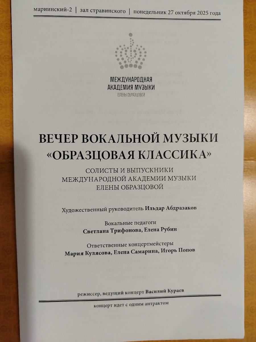 27 октября 2025 г., когда все нормальные люди большинство моих знакомых меломанов слушало в Мариинке-2 "Риголетто" с гастролёром Игорем Головатенко, я отправилась в Зал Стравинского на концерт "Образцовая классика", в котором участвовали солисты и выпускники Международной Академии музыки Елены Образцовой. В программе были заявлены арии и дуэты из опер Генделя, Моцарта, Чайковского, Верди, Римского-Корсакова, Сен-Санса, Беллини, Пуччини, Чилеа и Гуно, а также романсы Чайковского, Слонимского, Рахманинова, Верди. И песню Каннио "Влюблённый солдат" нам спели :) Программу помещаю: Каковы мои впечатления? Они очень разные🙂 Были почти беспомощные выступления (именно почти), были вполне профессиональные. Наконец, были выступления уже состоявшихся певцов. Хочу особенно отметить Марию Братухину (Идамант), Дмитрия Дмитренко (не просто спел, но и сыграл Галицкого), Ярославу Раильтянину (принцесса де Буйон) и Марину Пиняеву (Амина). Но больше всех мне понравилась Валерия Нелюбина с третьей арией
