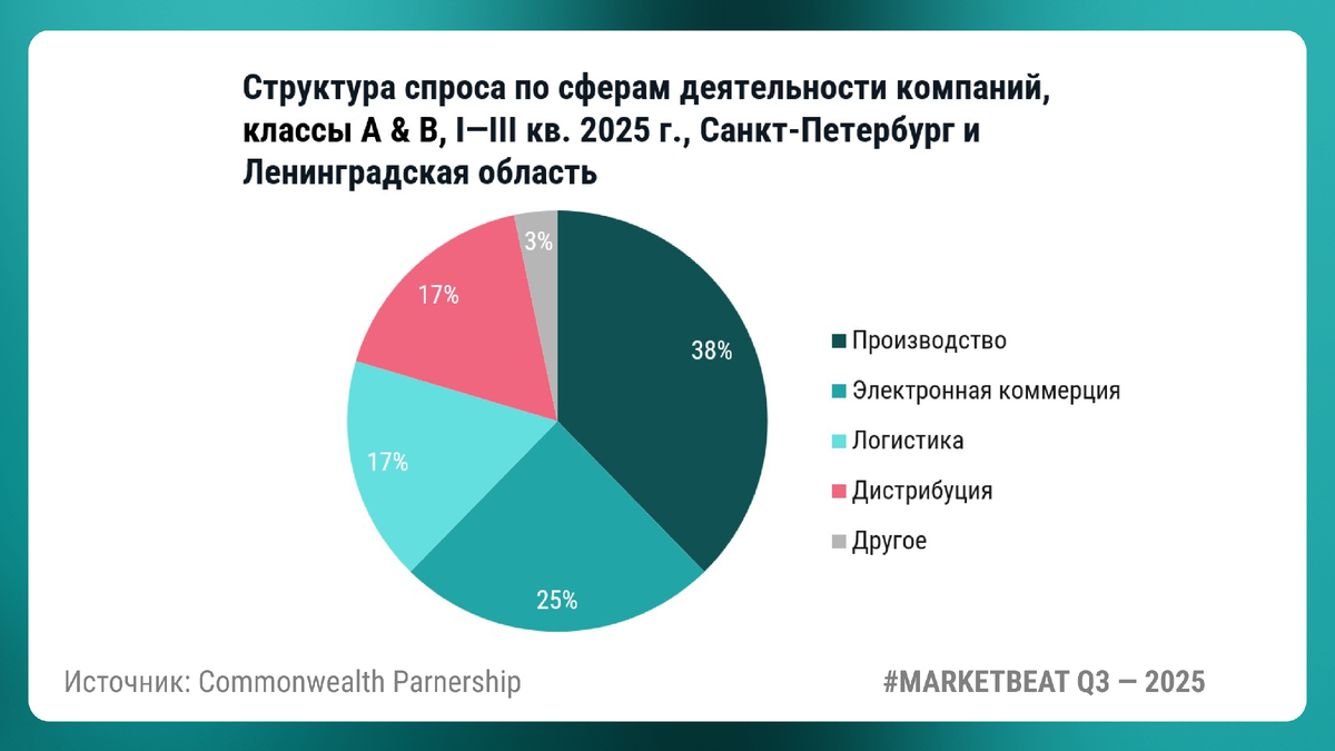 Согласно аналитическому отчету CMWP #MARKETBEAT, по итогам трех кварталов 2025 г. спрос на складском рынке Санкт-Петербурга и Ленинградской области снизился в три раза (128 тыс. кв. м) по сравнению с аналогичным периодом 2024 г. Лидером по наращиванию складских мощностей в общем объеме спроса стала сфера производства, сформировав в общем объеме спроса 38%.