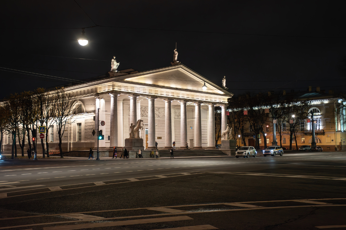 Центральный выставочный зал «Манеж»: Президентская библиотека имени Б.Н. Ельцина: На Сенатской площади: Вид с Английской набережной на Благовещенский мост и Академию художеств: Вид с Английской набережной на дворец Меншикова и Манеж Первого кадетского корпуса: Вид с Адмиралтейской набережной на Зоологический музей и Дворцовый мост: Несмотря на прохладную погоду и позднее время всегда находятся желающие совершить прогулку на теплоходе по петербургским рекам и каналам: Львы на Адмиралтейской набережной были изготовлены в 1832 году из листовой меди методом чеканки: На Дворцовой площади: Креативные селфи: На Большой Морской улице: Это был обычный осенний вечер в середине недели.