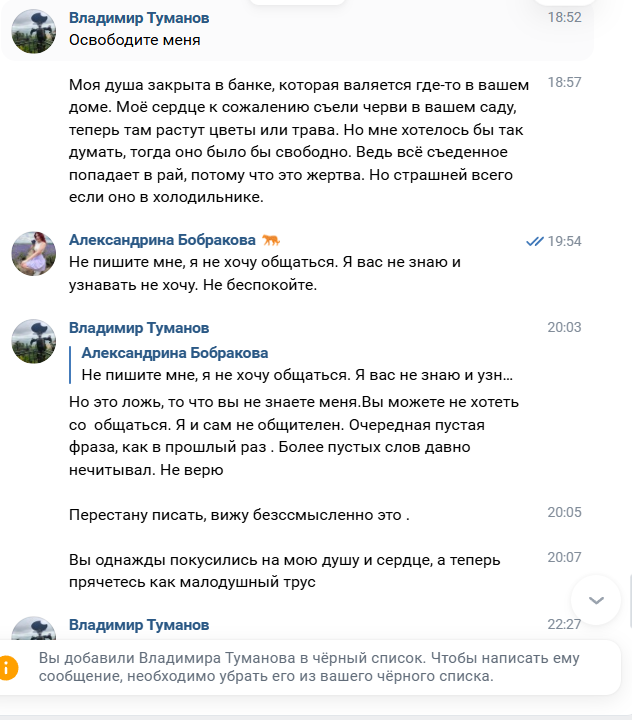 Я понимаю, что любая публичная деятельность привлекает внимание, но некоторые люди переходят границы. Такая ситуация уже не первый раз происходит в моей жизни. Я не ищу знакомств, я не ищу жениха! Я делюсь своими мыслями, фото, не более. Но вот не все понимают отказ. Я очень долго не освещала эту историю, но моё терпение закончилось. Человек постоянно вторгается в мою жизнь, поэтому больше не собираюсь это скрывать и замалчивать. Я уже лично просила мне не писать, и было это ещё год назад. До этого я просто не открывала сообщения, никак на них не реагировала, потому что я не ищу друзей-мужчин. Тем более, когда мне навязывают своё общество. Я этого человека заблокировала ещё в прошлом году, потому как моя просьба не писать не была услышана. До этого я получила свыше 800 сообщений! Ни на одно не отвечала, никак не реагировала, и до этого мы не были знакомы. Судя по всему, узнал он меня именно с Дзена, но почему-то решил, что мы близкие люди. Но это совершенно не так, я его даже не зна