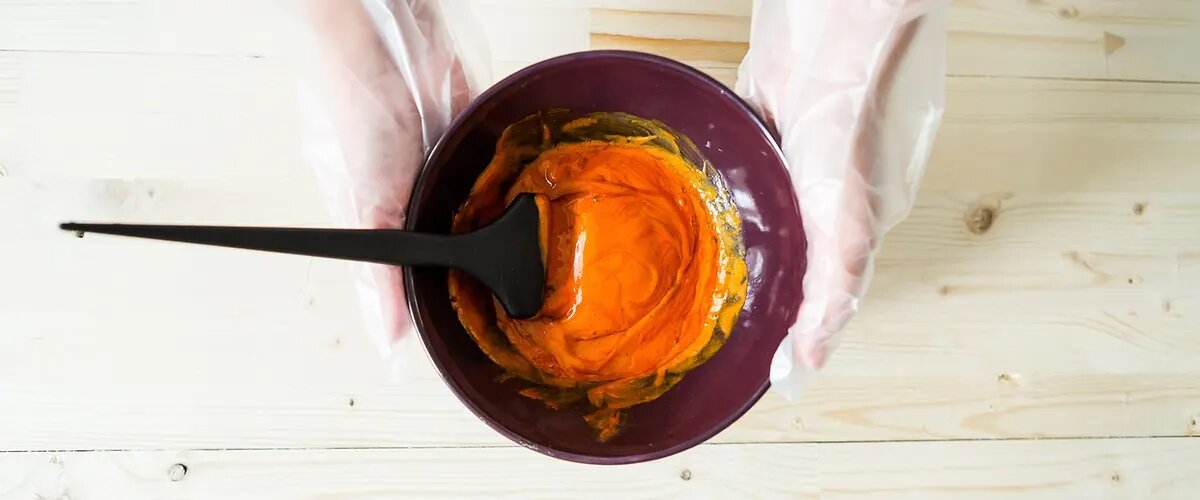 Наденьте перчатки и приготовьте смесь для окрашивания непосредственно перед нанесением. Обратите внимание на инструкции по применению краски. Там вы найдете информацию о том, нужно ли наносить краску на сухие или влажные волосы.