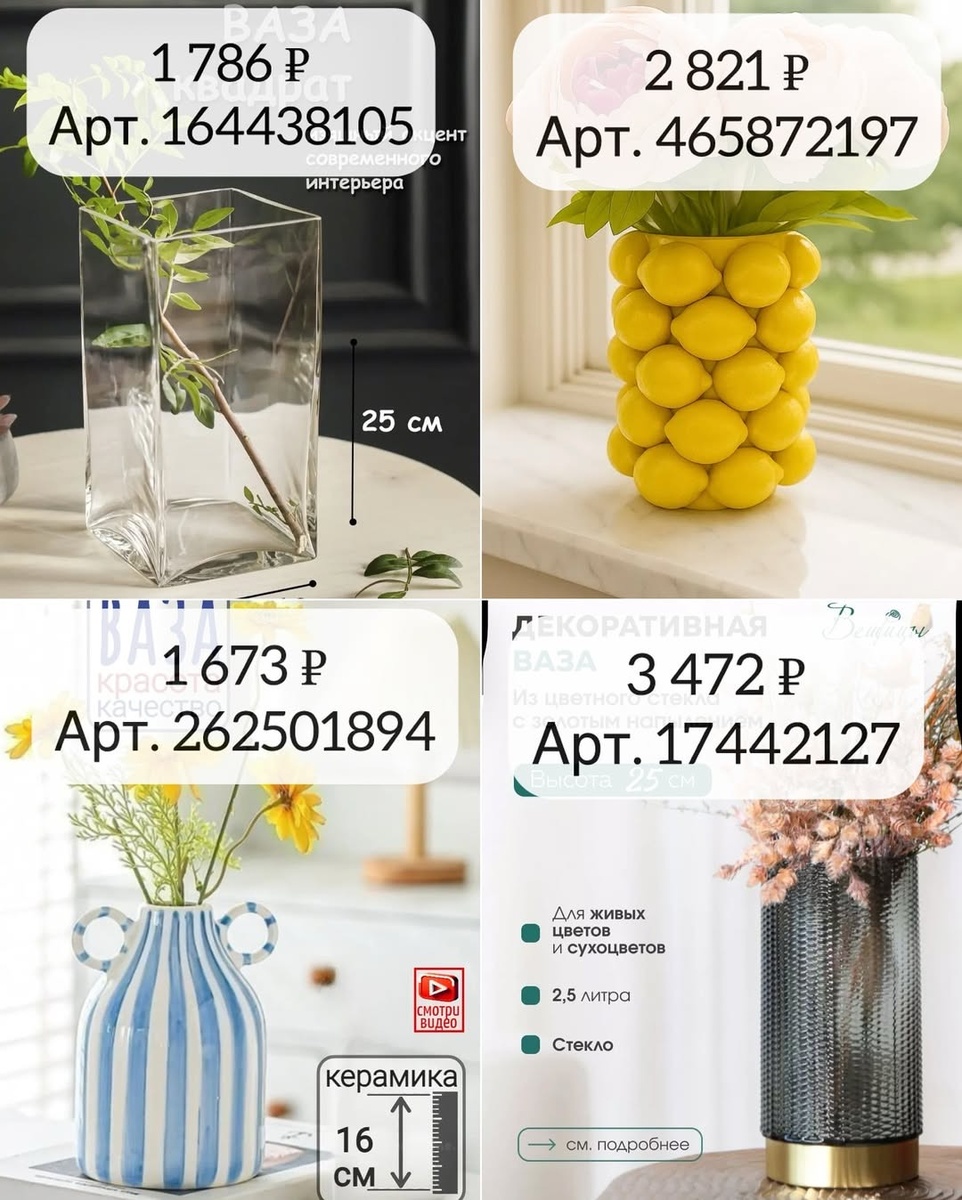 Я собрала коллекцию ваз, которые работают как маленькие скульптуры: они поддержат стиль комнаты даже без букета. Разбираем строго по порядку, как на фото — слева направо, сверху вниз в каждом коллаже.