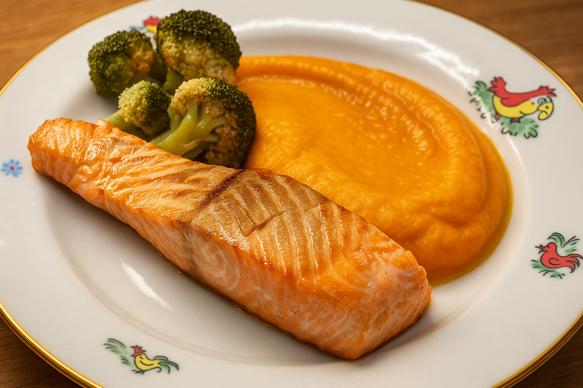 Вы знаете, что рыбу нужно кушать хотя бы раз в неделю?! А для растущего организма - это не просто рекомендация, а самое настоящее правило. Важно предлагать ребенку как красную рыбу, так и белую. Но не всегда ребенок согласен кушать рыбу, а в этом рецепте секрет во вкусном ярком пюре. Если малыш уже при виде рыбы начинает отворачиваться, можно рыбу помять вилкой и перемешать с пюре. Итак, нам понадобиться (на 2 порции): Первое, почистим картофель, морковь, тыкву. Нарезаем помельче, отправляем в сотейник картофель и морковь, заливаем водой и ставим вариться до готовности. Не забываем подсолить. Затем берем кусочек форели, солим с обеих сторон. Из фольги сделаем лодочку, укладываем туда кусочек форели. Кладем на него брокколи, подсолим и ее, сбрызгиваем маслом. Ставим запекаться на 200 градусов на 20 минут. К полуготовым картофелю и моркови добавляем тыкву, и варим до полной готовности всех овощей. Затем сливаем воду, взбиваем блендером наши овощи. Молоко и сливочное масло нагреть и выл