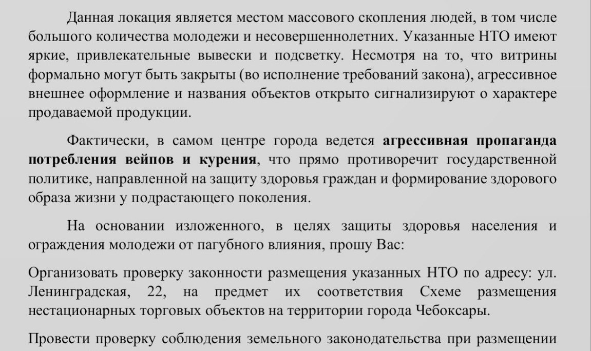 Направил в администрацию города обращение для проверки законности размещения ларьков с "вейпами" и прочими курительными товарами. Вообще, помимо этих "вредных" ларьков, в городе все больше бардака с нестационарными объектами, которые "засоряют" вид города, часто мешают проходу или даже занимают места для парковки авто. В современном городе так быть конечно не должно, депутаты ЧГСД от ЛДПР при рассмотрении схем размещения будут настаивать на запрете подобного размещения.