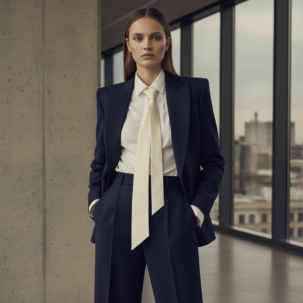 Галстук — это не просто ткань. Это язык, язык власти, формальности, амбиций. На протяжении столетий этот язык говорили только мужчины. В 2025 году молодые женщины начинают говорить на этом языке. И они говорят его не потому, что они хотят быть мужчинами. Они говорят на этом языке потому, что они требуют места за столом. Они требуют того, чтобы их слышали. Они требуют того, чтобы их амбиции воспринимались как допустимые, как нормальные, как просто часть того, что они есть.