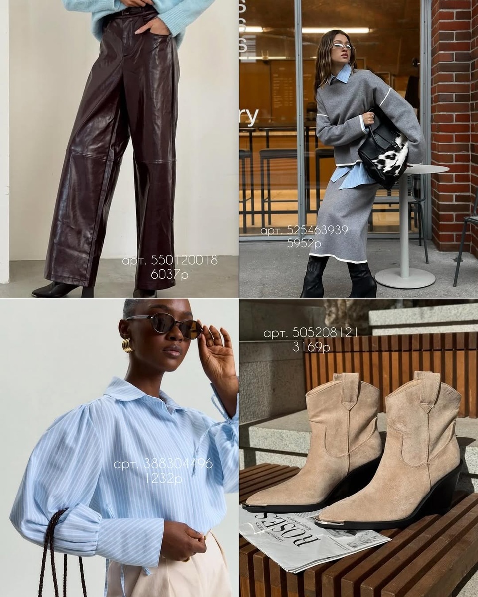 - Обувь под задачу: молочные трубы (561299260) — для светлых образов; казаки-беж (505208121) — для повседневных; лаковые бордовые (321208859/328139682/467367200) — для вечера и акцента.