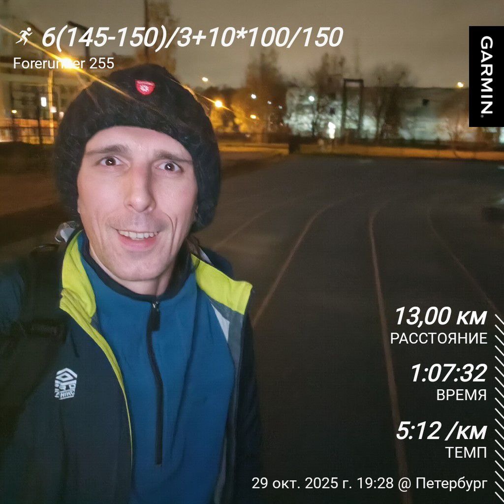 Не снимая розовых очков и не вдаваясь в детали, я великодушно спишу всё на изменения в тренировочном процессе — наверное, было больше интенсивных работ. Самая интересная из них, конечно, пришлась аккурат на 31 октября — 8 по 1000 м. Все твердят: «8 по тыще, 8 по тыще», а я ни разу не бегал. Теперь бегал! Темп 3:55, отдых — 2 минуты трусцой. Зашло тяжеловато, но, как показалось, с запасом. Заодно стало понятно, что форма действительно хуже, чем хотелось бы, и результат на полумарафоне в Гатчине тоже под большим вопросом.