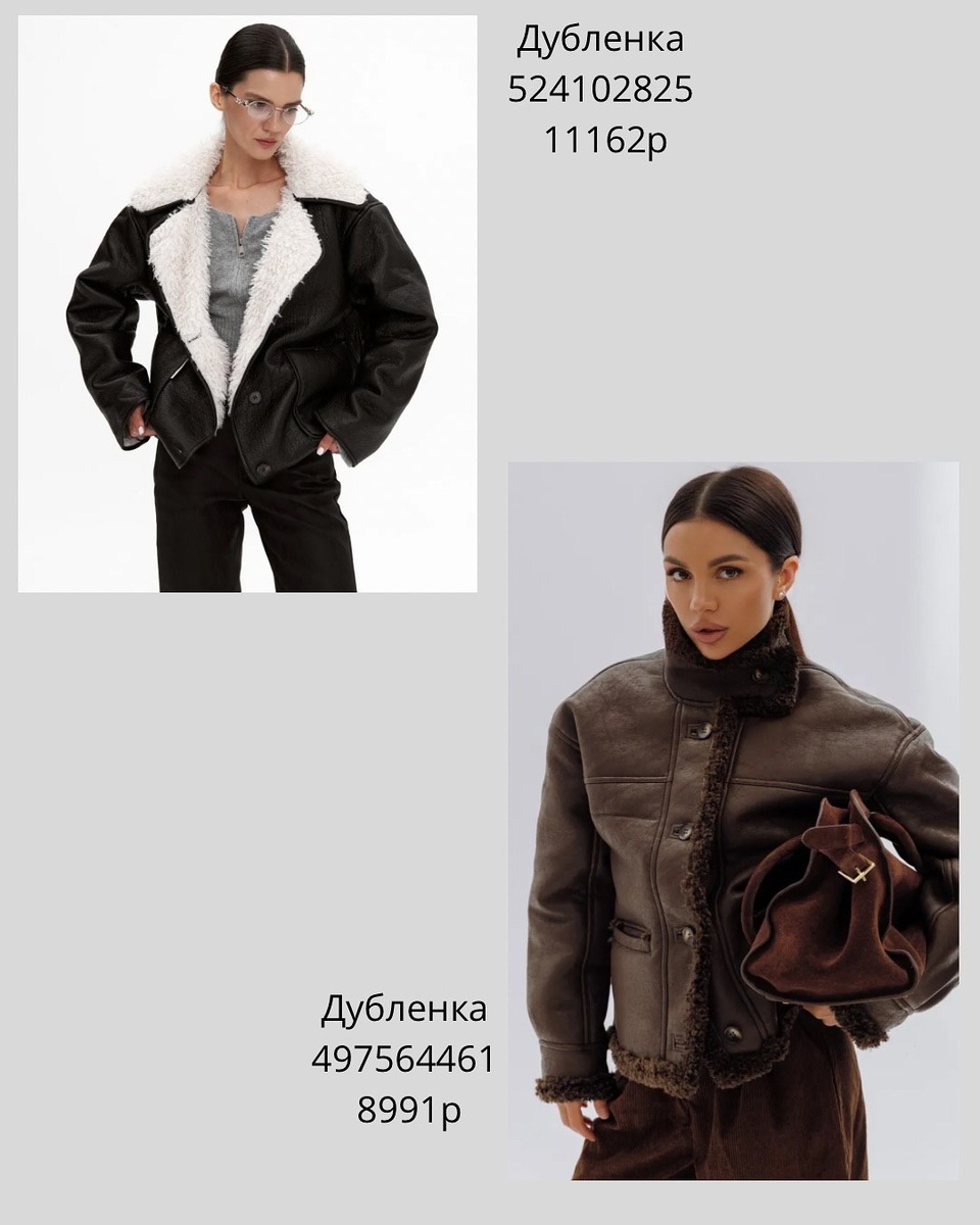 Зима — лучшее время для благородных фактур, объёмных силуэтов и уютных компаньонов. Я собрала для вас подборку вещей с понятной геометрией, красивыми оттенками и «умным» кроем. Идём строго по порядку — как на фото, с артикулами и моими советами стилиста. Короткая чёрная дублёнка с молнией и крупным белым мехом-«овчинкой». Широкий отложной воротник визуально делает плечи чётче, а прямой, слегка оверсайзный крой позволяет надевать на тёплый свитер. Длина до линии бедра — удобна и с джинсами, и с юбкой-миди. Совет стилиста: поддержите контраст отделки белым свитером-гольфом и тёмными джинсами прямого кроя. Обувь — грубые ботинки или сапоги на устойчивом каблуке. Какао-оттенок, мягкий ворс, высокий ворот с застёжкой — модель смотрится статусно и держит тепло. Пуговицы в ряд и аккуратные манжеты добавляют «портфельности». Совет стилиста: сочетайте с брюками из вельвета, кашемировым шарфом и сумкой в тёплой коричневой гамме. Получится спокойный, дорогой образ на каждый день. Двухпредметны