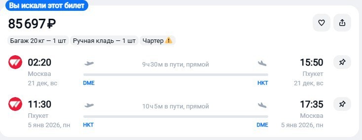 А чего бы не слетать? Особенно при такой выгодной цене на Новый год. Нашли для вас билеты из Москвы на Пхукет за 85 тыс. руб. Рейс прямой, отправление – 21 декабря, обратно – 5 января. Конечно, провести на таиландском курортном острове все зимние праздники не получится, зато такой вариант перелета втрое дешевле, чем например с 29 декабря по 10 января. Наличие мест на рейсе и тарифы мы проверяли в 17:30. @tourdom