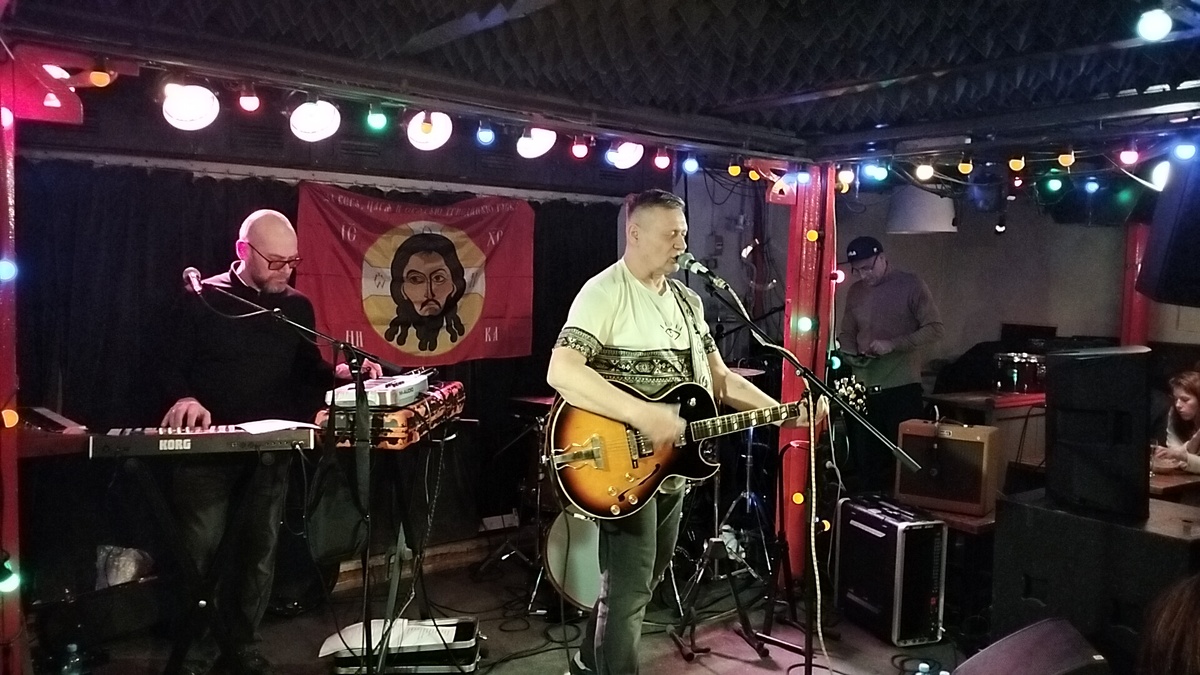 Напомню, что культовая московская рок-группа "БОТАНИКА" в середине девяностых стартовала из Харькова, а до этого была известна харьковским любителям рока как «Антоша Чехонте» и «Молчальная ночь». Песни «Под Луганском родился» и «Душа летела» вошли в саундтрек фильмов «Бумер-1» и «Бумер-2». В клуб "Китайский летчик" мы пришли небольшой делегацией и от "Руси Триединой", вручили знамя с Образом Спаса Нерукотворного. Эдик сразу это знамя водрузил на сцену!