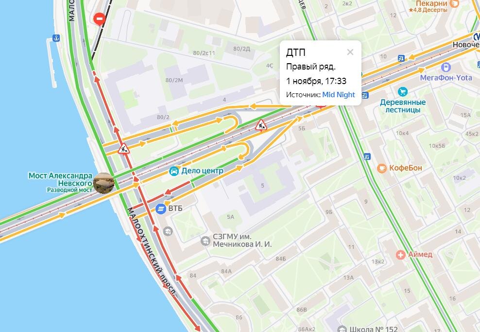 Затор образовался у моста Александра Невского в Петербурге сразу с двух сторон к шести часам вечера в субботу, 1 ноября. Об этом свидетельствуют данные сервиса «Яндекс Карты».