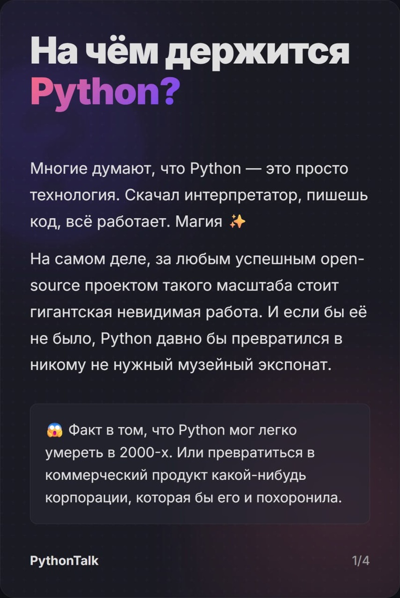 🏛 Невидимое правительство Python За каждым pip install стоит мощный фонд (PSF), корпоративные деньги и юристы. ❓Вы знали, что: ▫️до PSF была провальная попытка №1, и язык чуть не погиб вместе с лопнувшим стартапом ▫️у фонда есть программа Developer-in-Residence — по сути, наём топовых core-разработчиков на фултайм, чтобы они разгребали завалы в CPython ▫️специальный совет Steering Council решает, какая фича попадёт в язык. Листайте карточки и читайте небольшую статью: Невидимое правительство Python: кто платит за ваш pip install и владеет языком на самом деле ◀️◀️ #так_сложилось