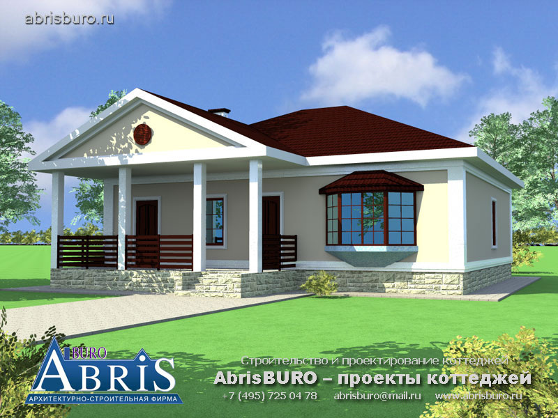 K035-100 Проект одноэтажного коттеджа с крыльцом, террасой и эркером из газобетонных блоков общей площадью 97,3 квадратных метров и габаритными размерами 12,0 x 10,2 метров в архитектурном бюро AbrisBURO.