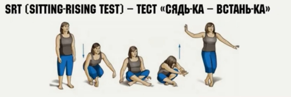 Sitting-rising test (SRT)- тест «сели-встали», разработанный бразильским врачом, специалистом по спортивной медицине Клаудио Соарес де Араухо. Цель теста- оценить гибкость, баланс и мышечную силу людей старшего поколения. Максимальное количество баллов — 10( 5 за подьем, 5 за опускание).За каждое вспомогательное касание (оперлись ладонью о пол или бедро, встали на колени, перевалились на бок и так далее) — снять один балл. В 2012 году в European Journal of Preventive Cardiology были опубликованы результаты исследования, проведённого де Араухо и его коллегами. Они оценили, как способность садиться на пол и вставать с него без поддержки связана с продолжительностью жизни людей среднего и старшего возраста. Выяснилось, что у людей, набравших низкие баллы в этом тесте (от нуля до трёх), шансы умереть в ближайшие шесть лет по любым причинам в пять-шесть раз выше, чем у тех, кто справился с заданием на отлично ( 8-10 баллов). Вообще откровенно говоря не многие дети/подростки легко сп