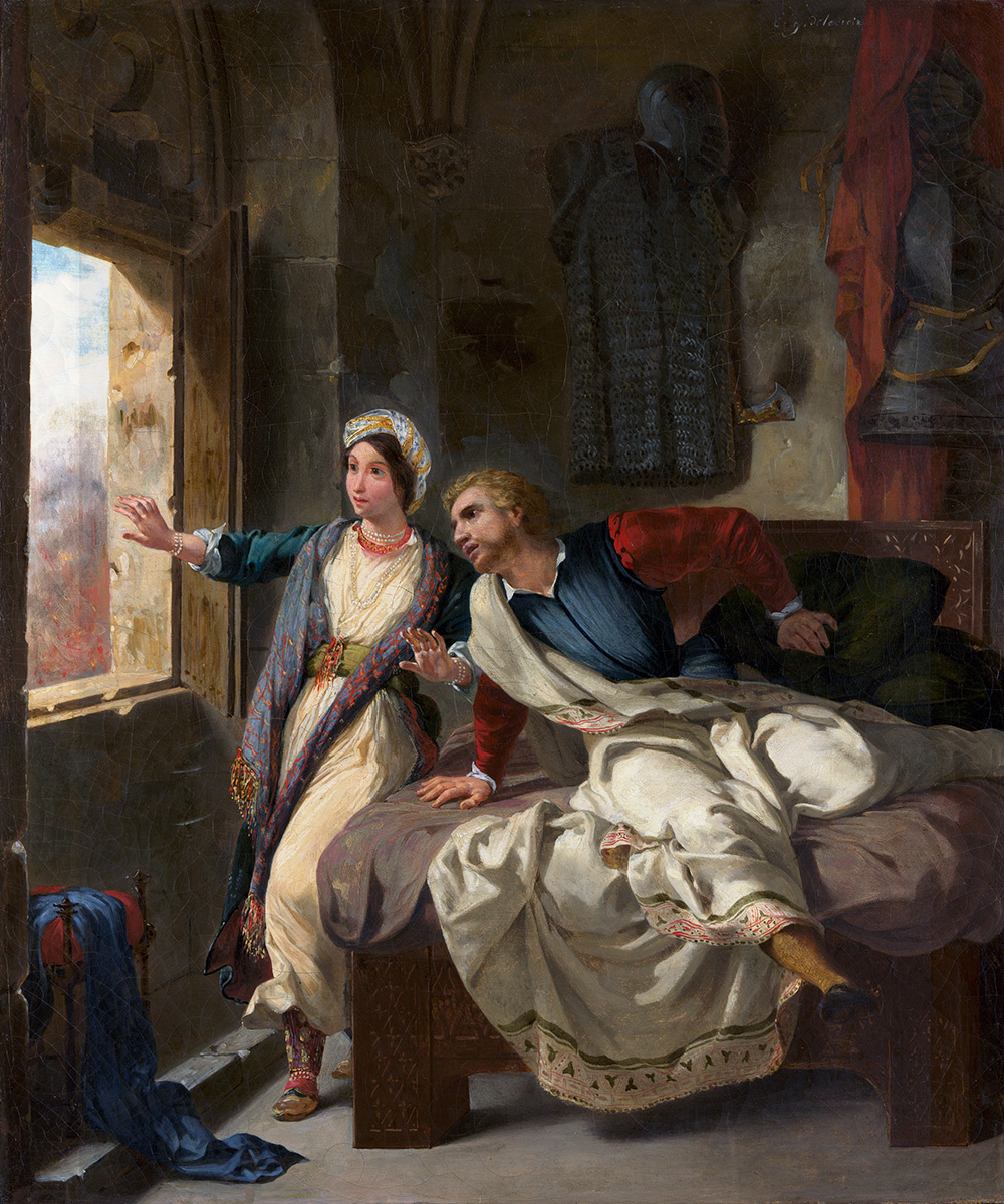 Это была первая работа французского художника Эжен Делакруа (1798–1863) с сюжетом, взятым из популярных романов сэра Вальтера Скотта о средневековом рыцарстве. Герой одноименного романа «Айвенго» (1819), пытаясь встать с постели, слушает испуганную Ребекку, описывающую ему бушующую за окном битву. Вместо того чтобы показывать саму битву, Делакруа решил простимулировать воображение зрителя, вызывая в его голове образы происходящего через жесты персонажей, реагирующих на то, что происходит внизу. Изысканное исполнение протянутой руки Ребекки ярко контрастирует с беспорядочными мазками краски вокруг неё, что намекает нам на безумие, свидетелем которого она стала. Этот взрыв цвета почти на четверть века предвосхищает трактовку Делакруа следующей сцены книги - «Похищение Ребекки» 1846 года. Картина была написана в 1823 году. Её размер 64.5 × 53.7 см. Хранится она в Метрополитен-музее. Статьи о творчестве и жизни Делакруа: P.S. Приглашаем вас посетить наш телеграмм-канал, там много всего и