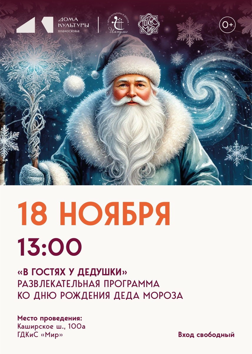 ✨ 18 НОЯБРЯ ДЕНЬ РОЖДЕНИЯ ДЕДА МОРОЗА «В гостях у Дедушки Мороза»: волшебная программа для детей и взрослых! ✨ 🎅 Приглашаем вас и ваших малышей на сказочное мероприятие, посвящённое дню рождения самого главного зимнего волшебника! Погрузитесь в атмосферу чудес, игр и праздничного настроения. ✨ Что вас ждёт: ➖торжественная встреча Деда Мороза под праздничный марш ➖весёлые хороводы и зимние танцы; ➖ «снежные» эстафеты ➖мастер‑классы по декоративно-прикладному творчеству, посвященные самому сказочному празднику ➖ Выставка-ярмарка ручной работы 🚫 Возраст: 0+ 📆 18.11.2025🕒13:00 🏢 Дворец культуры и спорта «Мир» 📍 г. Домодедово, Каширское шоссе, д.100А 💰 Вход свободный❗️ ✅ Мероприятия Домодедово https://dzen.ru/id/66f10385cc4c5a16f7b5fb02 http://vk.com/domodedovo_events http://dzen.ru/domodedovo_events