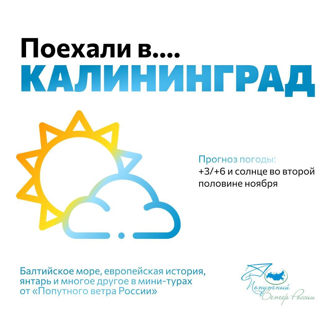 Если у вас отпуск в ноябре – отличная идея съездить в Калининград 🌿 Посмотрите, какая там погода: +3…+6, солнечно и сухо во второй половине месяца, и приятная морская атмосфера. Самое время гулять по Куршской косе, исследовать замки и греться кофе в атмосферных кафе! Мы можем собрать для вас индивидуальную программу. Напишите нам, и мы поможем устроить идеальный осенний мини-отпуск 💛 Связаться с вашим личным менеджером можно здесь: t.me/+79635079797