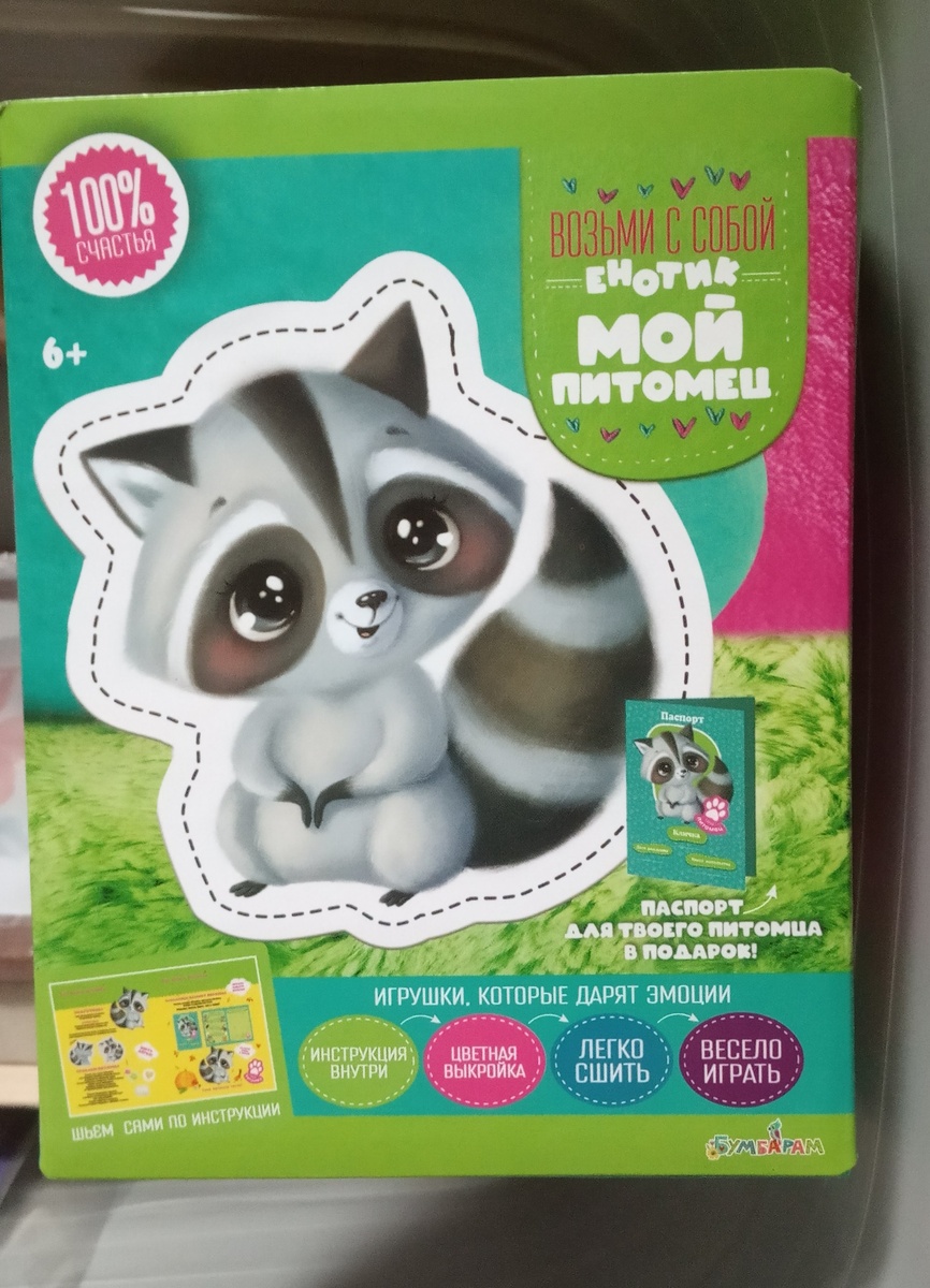 Всем привет! Сегодня расскажу о наборе для создания мягкой игрушки "Енотик" из серии "Бумбарам" "Мой питомец". Мы купили по акции три набора в магазине "Ещё". Такие игрушки предназначены для детей от шести лет, дочке как раз шесть. В этой серии есть разные зверюшки, мы купили ещё лисёнка и зайчика (пока не шили, так что о них позже напишу). Без акции игрушка стоила гораздо дороже, что можно видеть на этикетке. На обратной стороне перечислено, что входит в этот набор. Это, прежде всего, пакетик с наполнителем (синтепухом), цветная выкройка на ткани, инструкция. Игла и нить не прилагаются, но думаю, есть дома у каждого. В подарок идёт картонный паспорт питомца, который ребёнок может заполнить сам, написав имя зверюшки, дату её рождения, место жительства, любимые занятия и т. д., а также нарисовав свой портрет с питомцем. На обороте "паспорта" изображены мечты питомца, которые позволяют лучше узнать характер зверька. Милая деталь - деревянное сердечко. Его нужно вложить внутрь игрушки, чт