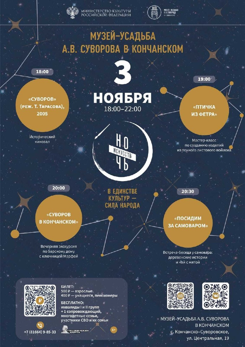 ✨ Приглашаем на «Ночь Искусств» 3 ноября в музее-усадьбе А.В. Суворова в с. Кончанско-Суворовское!