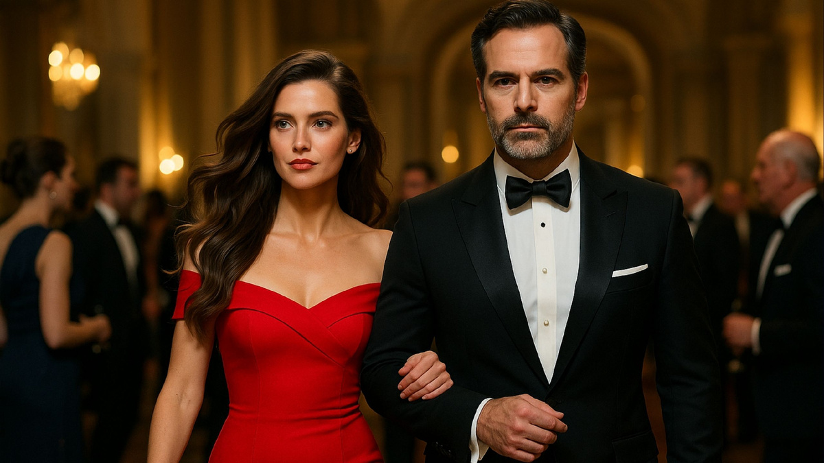 Внезапно, в зале погас свет, и по залу пробежал лёгкий ропот. Все взгляды устремились на балкон, где в свете софитов появились двое. Первый — высокий мужчина в строгом тёмном костюме, с прямой осанкой и уверенной походкой. Его лицо озарила лёгкая, спокойная улыбка, и он неторопливо начал спускаться по широкой лестнице, как будто чувствовал себя здесь хозяином. За ним шла женщина. Её появление вызвало удивлённый шёпот. Она была в сверкающем вечернем платье, которое мягко поблёскивало в свете ламп, подчёркивая её фигуру и изящество. Волосы аккуратно уложены, открывая шею и лицо с безупречным макияжем. Её взгляд был прямым, спокойным, но в то же время властным. От её присутствия повеяло такой внутренней силой и достоинством, что зал на мгновение замер. Она спускалась по лестнице медленно, уверенно, с той грацией, которая бывает только у женщин, знающих себе цену. Её рука лежала на локте мужчины, и в этом жесте не было робости — только партнёрство и равновесие. Она шла не за ним, а рядом, и каждый шаг говорил: теперь она на своём месте.