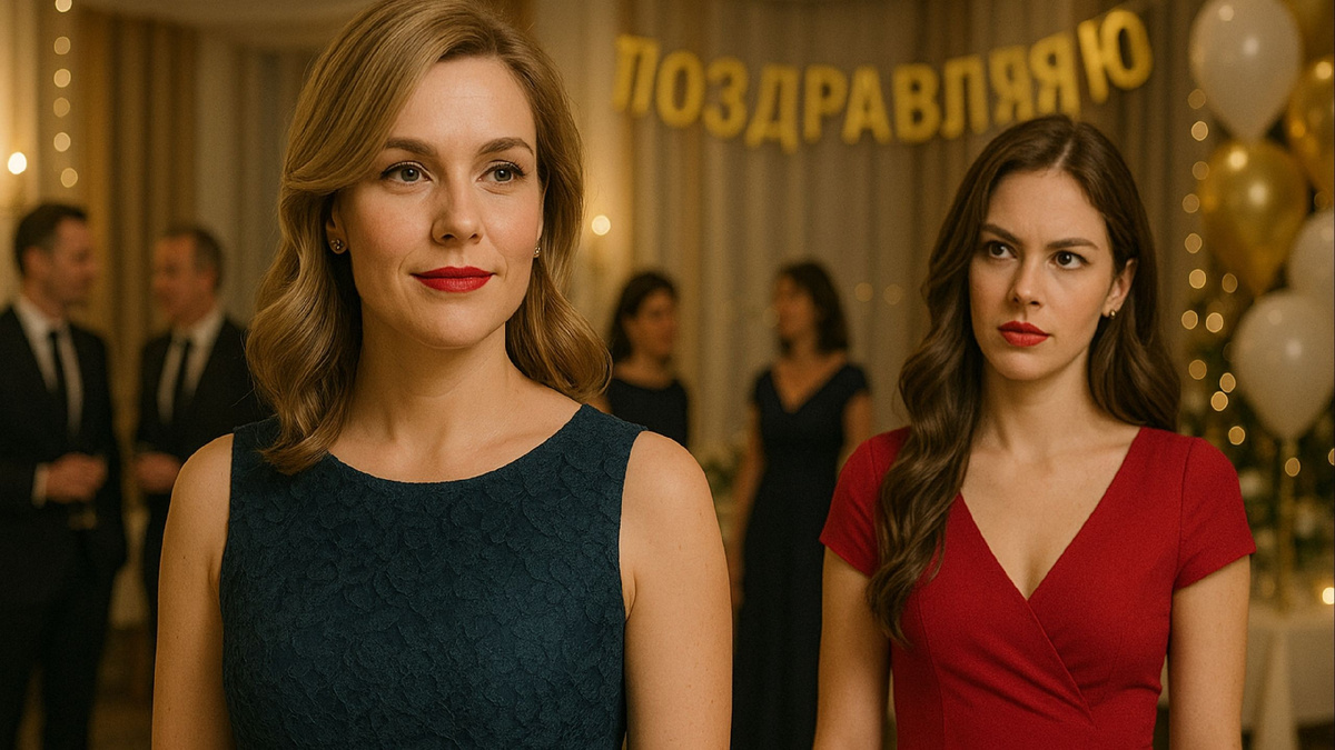 Марина идёт, не стесняясь. Наоборот — с вызовом. Словно хозяйка вечера. Гости оборачиваются, переглядываются. Женщины сжимают губы, мужчины — опускают глаза. За столом звучит напряжённый шёпот.