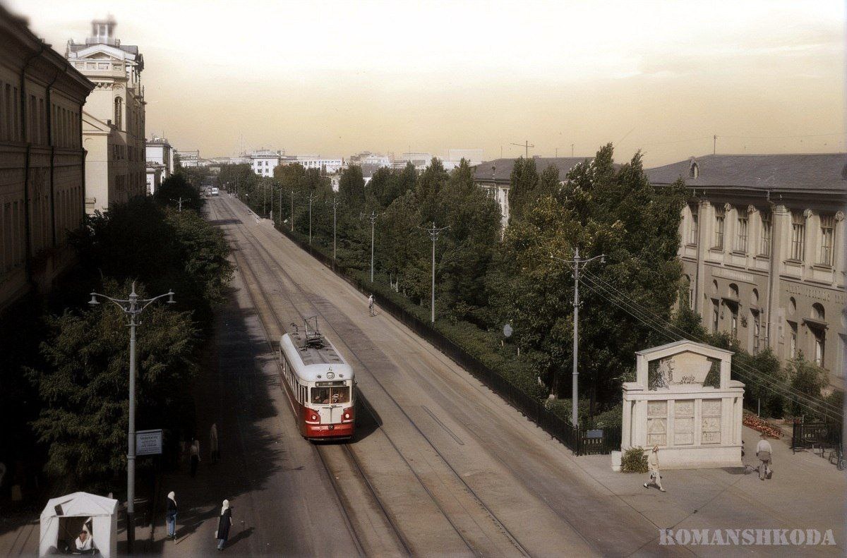 Больше всего на себя обращает внимание огромная полоса из деревьев. Да, на «Академической» когда-то был сквер – сегодня на этом месте широкая проезжая часть. Шкода обратил внимание, что в 50-е проезжая часть на Рабоче-Крестьянской была раза в два уже, чем сейчас, а на противоположной стороне ходи трамвай: - Слева хорошо виднеется башня Дома водников (колоризация современная). Но вот что удивительно: с другой стороны улицы, между проезжей частью и домами - настоящий сквер! Видно, что по проезжей части ходит трамвай и от его рельсов - по одной полосе в каждом направлении. Все поменялось кардинальным образом в 60-е. Трамвай – убрали, сквер был ликвидирован полностью. А проезжая часть стала аж шестиполосной. - И хотя тротуар там по-прежнему достаточно широк - сквер там, конечно, теперь уже не разместишь.