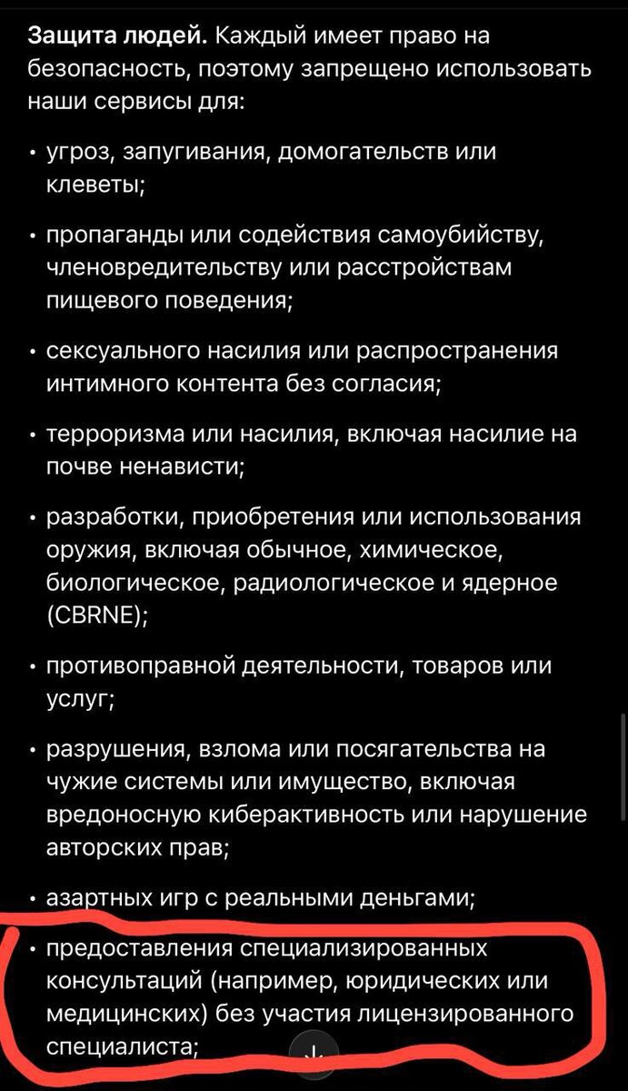 ChatGPT больше не будет выдавать советы по вопросам здоровья и права. OpenAI приняла решение перестраховаться и полностью исключила возможность предоставления рекомендаций в этих областях. Согласно новым требованиям, нейросети запрещено давать индивидуальные советы, анализировать симптомы по фотографиям и предлагать решения по личным юридическим вопросам. Теперь бот сможет лишь предоставлять справочную информацию из открытых источников и рекомендовать обращаться к квалифицированным специалистам. Постмейкер - автоматическое ведение канала 🤖 Анимация | СhatGPT-4 | Помощь с резюме
