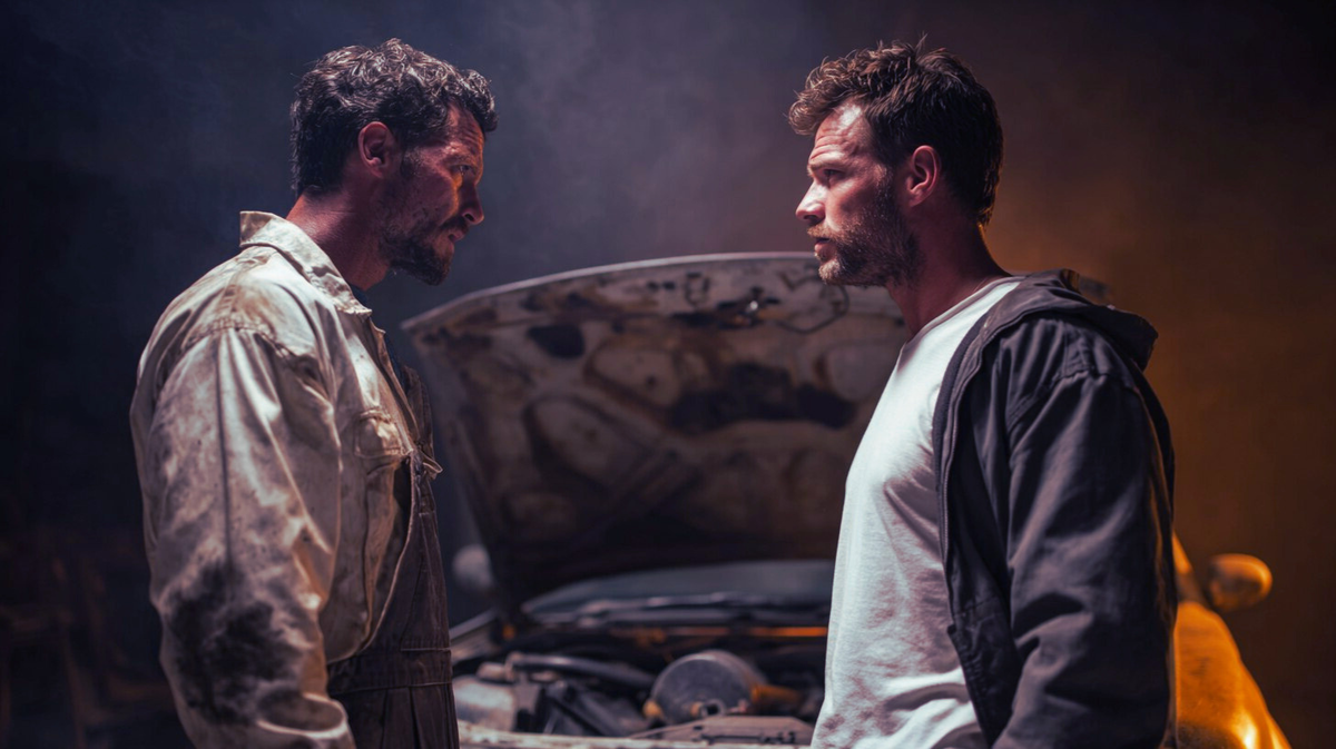 Он сделал шаг назад, упираясь в верстак, ища опору. Его взгляд метался по гаражу, по разбросанным инструментам, по полутёмным углам, где копились старые запчасти, — по всему, что раньше было их общим миром, а теперь превратилось в место суда.