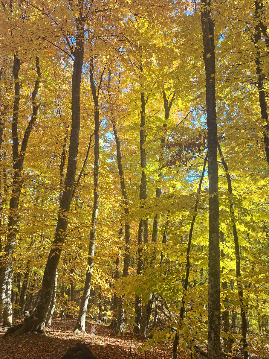 В это последнее октябрьское воскресенье была прекрасная погода. Душа и тело требовало прогулки по лесу, НО....у нас было всего два свободных часа. Куда поехать? Где прогуляться? Дорога выбрала за нас. Пока мы с мужем совещались, случайно повернули на новую объездную дорогу на Ялту. Ангарский перевал стал отправной точкой нашего мини-путешествия. Как всегда, на перевале очень много машин. Мы с трудом нашли место для парковки. Начали путь возле памятника троллейбусу, прошли Метеостанцию и кафе «Старик Хинкалыч». На парковке кафе ооооооочень много машин. Хорошо, что свою мы оставили на ост. "Ангарский перевал" под пристальным взором работников ГИБДД. На парковке есть стэнд с картой маршрутов. Мы выбрали к Кутузовскому озеру и роще секвой. Прошли мимо новой стройки то ли кафе, то ли беседки для отдыха и поднялись по довольно крутой горе. Вышли на поляну. Здесь нас ждал сюрприз. Очень много школьников и большие группы туристов. На секунду мне показалось, что я не в лесу, а в су