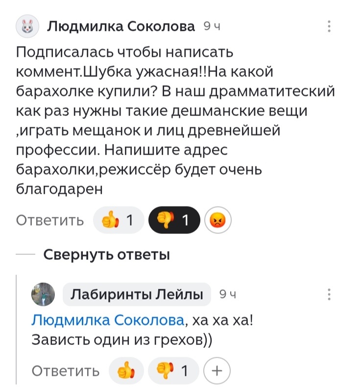 Привет, друзья! Тут как-то не так давно я писала о том, что купила новую шубку из норки=> Много различных мнений эта публикация вызвала, в том числе и вот это мне написали 😁😁😁 На самом то деле шубка очень милая и у всех вызывает только восторг и положительные эмоции, когда меня в ней видят, я писала уже об этом вот тут=> Хочется отметить, что это не единственная "теплая" вещь в моем гардеробе, у меня есть много одежды на разные случаи жизни, эта же шубка больше для походов в театр или на другие мероприятий подходит. Моя знакомая тут на днях спросила меня теплая ли эта шубка и подойдёт ли она для суровой зимы, для морозов. Я ответила, что эта вещь больше для "выпендрежа" подходит, когда хочешь именно покрасоваться, это одежда не на каждый день, не для стояния на остановке в мороз и не для похода на рынок за картошкой , это же явно заметно . В такой верхней одежде надо что бы тебя привезли на машине до места событий, высадили, и ты стуча каблучками, прошлась, немного пок