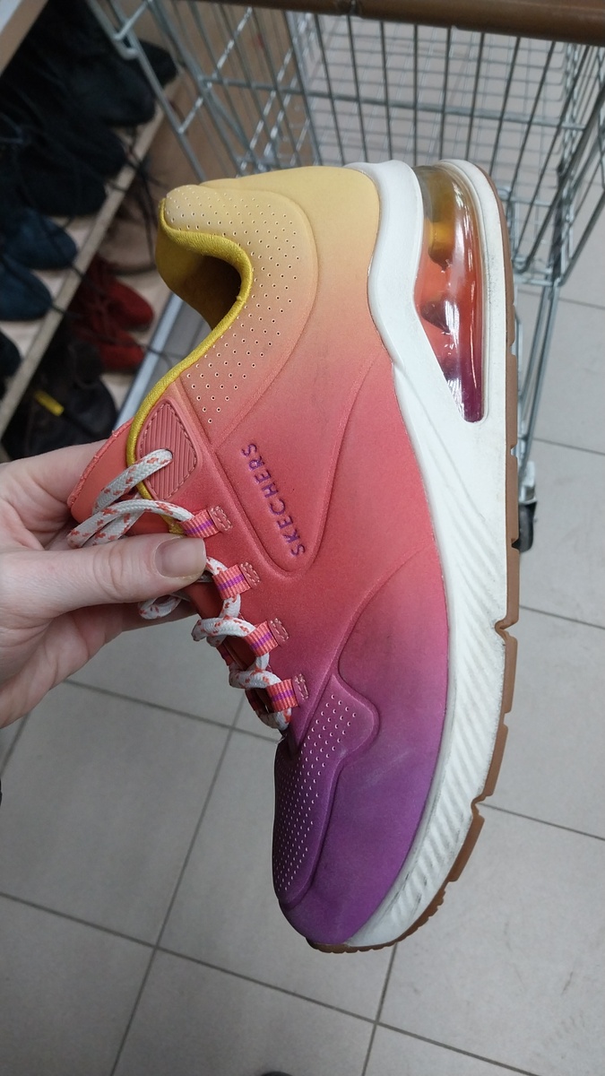 В пятницу традиционно скидка в Вове 50%, но с дисконтной картой ещё минус 10%, поэтому 60%. В этот раз я была на завозе (кстати, взяла со скидкой себе ботинки, которые в субботу не увидела), не могу сказать, что особо много за неделю раскупили, по ощущениям, полки не поредели. Разве что спортивная обувь ушла быстро. Понравились кроссовки от Sketchers 38 размера. Цена без скидки 1700 рублей. Материал будто вспененый, а подошва как у Nike air max. Я сама ещё не носила обувь этой марки, но когда примеряла, было чувство удобства и комфорта. Легчайшие Dockers по такой же цене. Новые, но без стельки. Видно, что не носили. Порядок цен на марку можно увидеть на скриншоте. Интересная пара кроссовок от Nike – плетёная структура. Puma. Эти 2 пары уже по более высокой цене – 2200 рублей (на них скидка до 30% максимум, и карта не действует). Эти Nike тоже по такому же ценнику. Это Asics, сейчас марка довольно дорого у нас продаётся, и не везде можно найти. Brooks – небюджетный бренд, и я их в