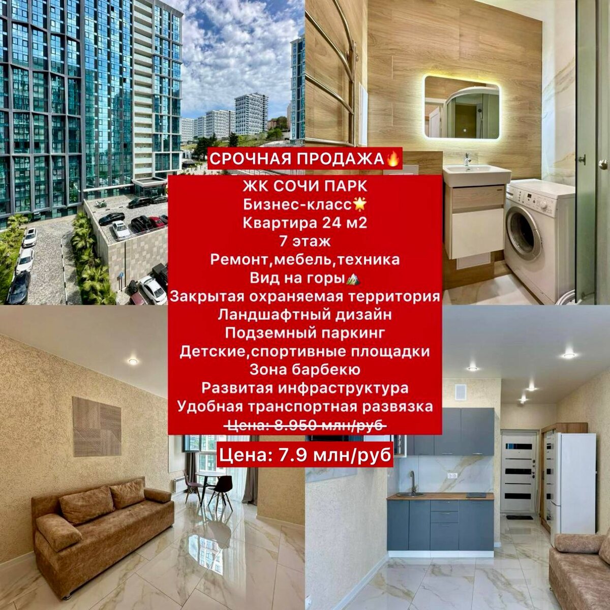 *СРОЧНАЯ ПРОДАЖА❗️* *Лучший ЖК в СОЧИ* _Бизнес-класс🌟_ ◾️Квартира 24 м2 ◾️7 этаж ◾️Ремонт,мебель,техника!!!!!!!!!! ◾️Вид на горы🏔️ ◾️Закрытая охраняемая территория ◾️Ландшафтный дизайн ◾️Подземный паркинг ◾️Детские,спортивные площадки ◾️Зона барбекю ◾️Развитая инфраструктура ◾️Удобная транспортная развязка *Снижение стоимости🔥* ~❗️Цена: 8.950 млн/руб~ *7.9 млн/руб* Цена ниже плинтуса, поэтому срочно звони или пиши на телефон 📱 +79273370701 Айрат