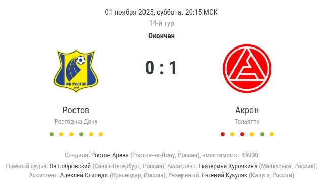 В рамках 14-го тура сезона 2025/26 сегодня «Ростов» принимал тольяттинский «Акрон». Это первая встреча команд, следующая пройдёт в Тольятти ориентировочно 9 мая следующего года (29-й тур). Нынешние соперники ростовчан - команда молодая (2018) и напористая. Стоит напомнить, что это именно «Акрон» в сезоне 2022/23 стал финалистом Пути регионов Кубка России, обыграв в том числе «Локомотив», «Динамо» и «Спартак». А уже в следующем сезоне тольяттинцы буквально ворвались в Российскую премьер-лигу. Мастерства, конечно, ещё недостаточно, но куража много - и это часто помогает. На начало игры «Акрон» располагался на 13-м месте, «Ростов» - на 10-м. Первый тайм был трудным для «Ростова» - гости дерзко атаковали. Но на перерыв ушли при нулевом счёте. А вот во втором случилось нехорошее. Роналду получил красную и покинул поле. Беншимол уверенно реализовал пенальти и вывел гостей вперёд. Впору было бы отчаяться, но уже через три минуты Егор Голенков сравнивает счёт. Проверяли на возможный офсайд - д